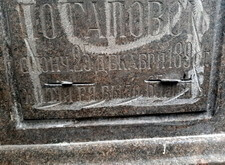 Тем временем мы изготовили табличку, закрывающую лицевую сторону надгробья, а также православный крест, венчающий памятник. Установка этих элементов завершила реставрацию памятника и мы взялись за укладку гранитной брусчатки, оставив в одном из углов участка место под квадратную клумбу. Брусчатку замыли водой и оставили высыхать, в цветник же насыпали мульчу. Окончание работ на данном месте захоронения происходило в тёмное время суток, так как для заказчика срочность благоустройства была одним из решающих критериев при выборе мастеров.